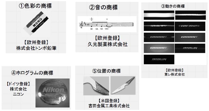 今回導入された新しいタイプの商標は、「色彩」「音」「動き」「ホログラム」「位置」の5タイプです。