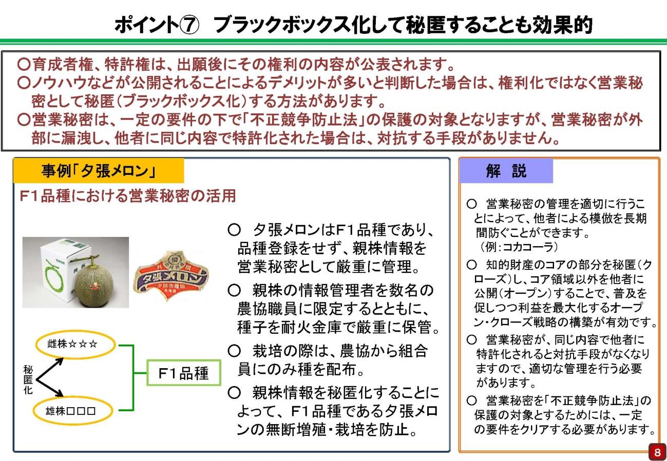 ここで,これからの農業に知的財産権を活用するといっても,特許や育成者権を取得するには相当の費用がかかりますので,小規模な経営が多い我が国の農水分野における活用としては,営業秘密としての保護を活用するのが現実的な手段であると思われます。
